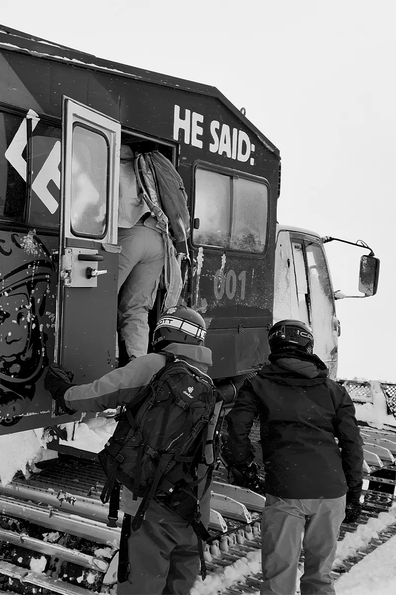 Die Snowcat hat eine moderne Personenkabine mit 13 Sitzplätzen (meistens nur mit 9 bis 10 Personen belegt) auf der Basis von Pistenbully, ein aktuelles Kässbohrer-Produkt aus Ulm. Die geringe Zahl an Freeridern sorgt für kurze Wartezeiten und mehr Abfahrten. Das zügige Abnabeln der Snowcat von der Gruppe und die strategisch geschickt angelegten Trassen im Gelände bedeuten ein Mindestmaß an Wartezeit. Der Vorteil gegenüber Heliskiing: Es gibt weniger Downdays, denn die Snowcat bringt dich auch bei Schneefall auf den Berg.